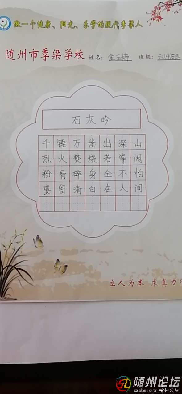 本帖最后由 保質(zhì)期 于 2019-3-12 09:38 編輯 隨州市季梁學(xué)校六(4)班金玉婷書法作品